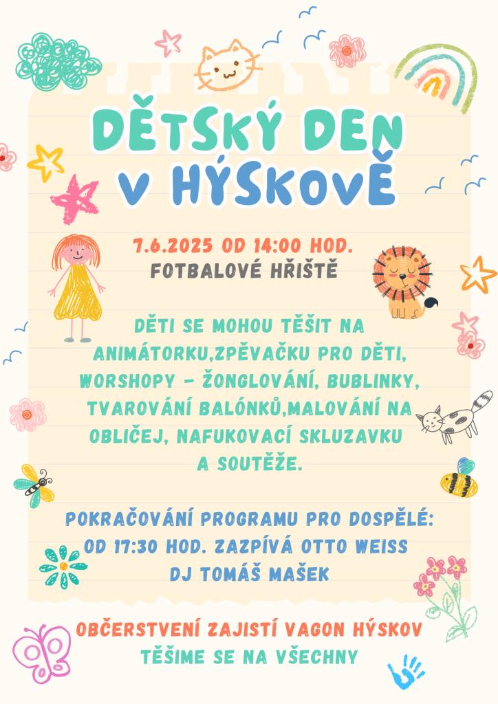 Přijďte se pobavit na Dětský den v Hýskově. Děti se mohou těšit na animátorku, žonglování, bublinky, tvarování balónků, malování na obličej, nafukovací skluzavku, soutěže a na můj hodinový program pro děti s písničkami od 14.30.